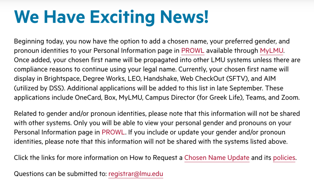 Recent news stories reported that a professor in LMU’s Department of Theological Studies forces his students, on penalty of reduction of their grade, to include their personal pronouns next to their name in their classwork. This practice must stop immediately because it is a direct violation of LMU’s mission.