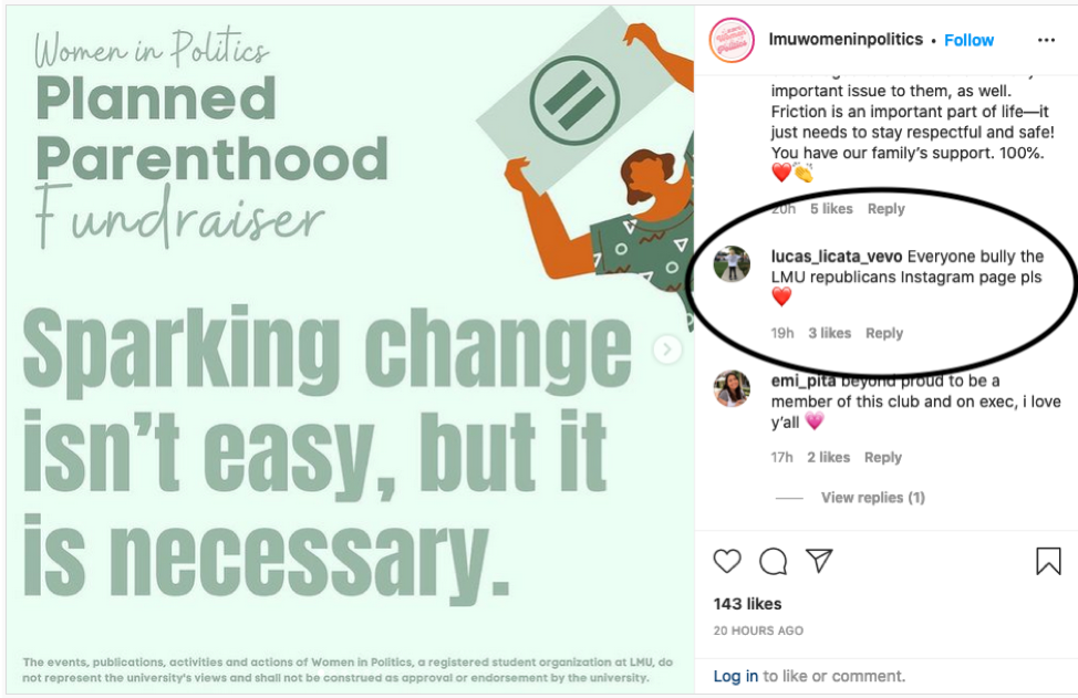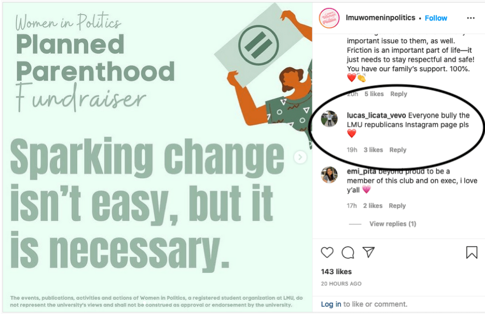 Catholic students on campus have been bullied, harassed, and even sent messages like, “we hope you die.” For example, consider the following post “Everyone bully the LMU republicans Instagram page pls [please]” from one LMU student against another group of LMU students: