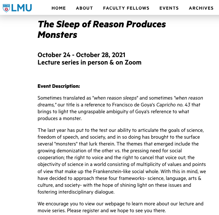 You’ll note that this message, aside from the word ‘sacramental’, has nothing whatsoever to do with anything Catholic. Likewise, the programming this semester (see screenshot below) entitled “The Sleep of Reason Produces Monsters” has nothing whatsoever to do with Catholicism.