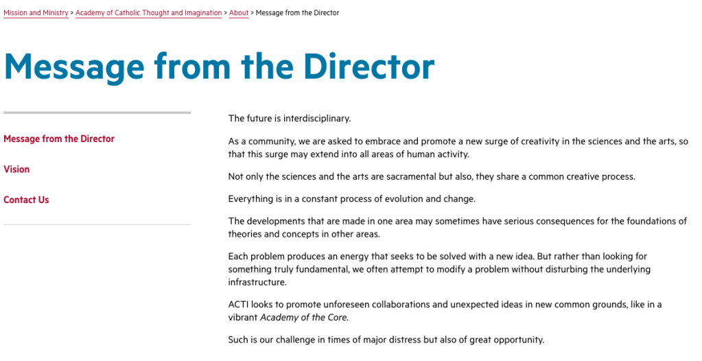 Given this history and mission, it is surprising to read the Academy of Catholic Thought and Imagination’s current “Message from the Director”, a screen shot of which you can find below. It reads,